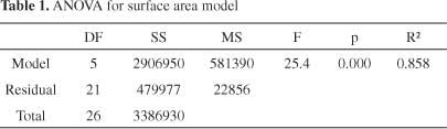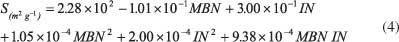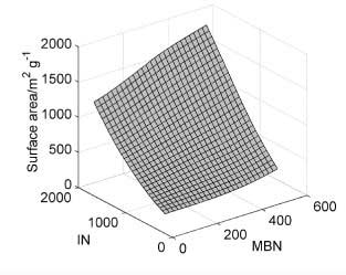 為了描述亞甲基藍(lán)和碘的數(shù)量相對(duì)于表面積的行為,使用二次模型。對(duì)于模型開(kāi)發(fā),Kennard-Stone算法從105個(gè)樣本中選擇了27個(gè)樣本并用于校準(zhǔn)。樣品表面積從199到2105 m 2 g -1不等。亞甲基藍(lán)的數(shù)量在0到501毫克克每升之間,碘值從155到1670毫克克每升。建模后獲得的表面擬合(圖1)由公式4描述。