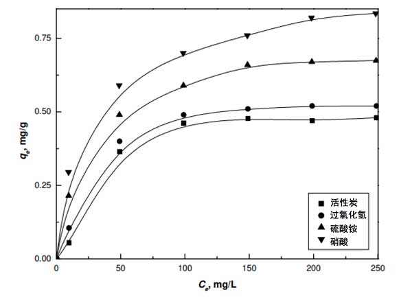 用活性炭和改性活性炭進(jìn)行平衡吸附實(shí)驗(yàn),以評(píng)估它們使用合成的鎳廢水從水性介質(zhì)中除去二價(jià)鎳的能力。通過(guò)用0.1g活性炭與50mL濃度范圍為10mg/L至250mg/L的Ni(II)溶液平衡進(jìn)行實(shí)驗(yàn),結(jié)果顯示在圖2中。活性炭的每克吸附容量值按以下順序增加:活性炭>過(guò)氧化氫>硫酸銨>濃硝酸。氧化活性炭的容量增加是由于存在大量酸性基團(tuán),其可以與水溶液中存在的陽(yáng)離子鎳交換它們的質(zhì)子。