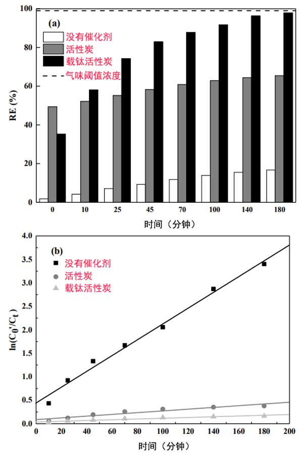 圖2:活性炭和載鈦活性炭在蒸餾水中光催化降解2-甲基異冰片的(a)去除效率和(b)動力學(xué)。