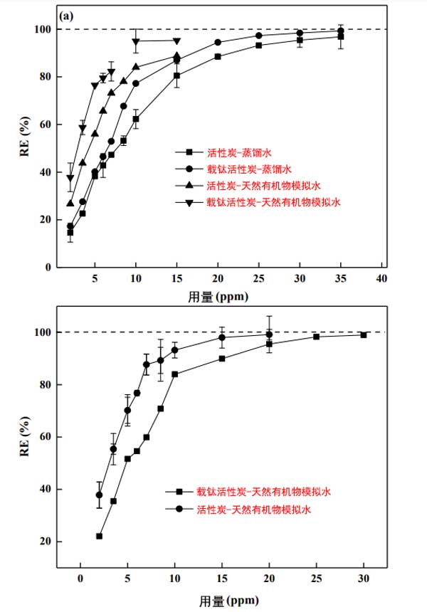 天然有機(jī)物的主要成分是腐植酸和單寧酸,因?yàn)樗鼈兤毡榇嬖谟诟鞣N天然水中。圖3顯示了從蒸餾水和天然有機(jī)物水中消除2-甲基異冰片的情況,這取決于光降解前后催化劑的用量。如圖3a所示,發(fā)現(xiàn)兩種催化劑在天然有機(jī)物水中的去除更接近。然而,腐植酸和單寧酸的存在導(dǎo)致活性炭和載鈦活性炭對2-甲基異冰片的吸附能力顯著降低。此外,為了達(dá)到氣味閾值濃度值,兩種催化劑在低天然有機(jī)物濃度的水中所需的劑量比在蒸餾水中增加了大約一倍。這種現(xiàn)象表明天然有機(jī)物和2-甲基異冰片之間對于兩種催化劑的活性位點(diǎn)存在競爭關(guān)系。同時,值得注意的是,當(dāng)微生物分子接近模型污染物時,競爭吸附最強(qiáng)。然而,在光降解后,載鈦活性炭對2-甲基異冰片的去除效率顯著提高(圖3b)。