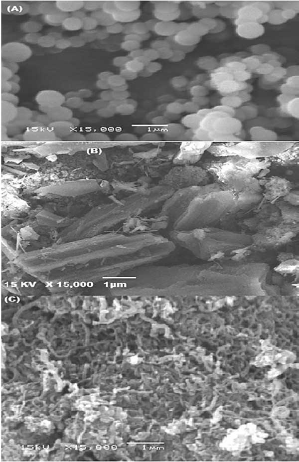 這種方法是檢查活性炭表面形態(tài)的有用方法。圖1A和1B展示了丙烯腈-共聚苯乙烯(A)和活性炭浸漬后的(B)SEM照片。這些圖顯示了球形、均勻形狀的結(jié)構(gòu),改性方法導(dǎo)致改性復(fù)合顆粒尺寸增加了7.95%。此外,圖1C顯示了制備的納米碳管的SEM圖片。該圖顯示了未處理樣品中存在無定形碳。此外,值得注意的是,這些管子又細又長,并且沒有大量凝聚在一起。納米碳管的管狀直徑介于75和99.25nm之間。