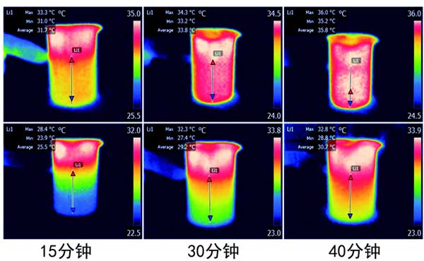 圖3:輻照下的紅外圖像,浸沒(méi)的載鈦活性炭(頂部)和載鈦活性炭/泡沫(底部)。