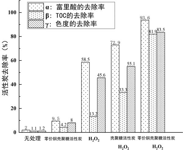 富里酸、TOC、色度的去除率分別以α、β、γ表示,如圖2所示 。從圖中可以看出,氧化劑H 2 O 2 的加入是至關重要的。實驗組用H 2 Ø 2倍加有較好的去除富里酸,TOC和色度相比,有活性炭催化劑的組比沒有催化劑的組實現(xiàn)了更高的去除率。三個指標的去除率都有所提高,尤其是TOC的去除率明顯提高,從13.2%提高到81.9%,說明零價銅的加入可以大大提高催化濕氧化法反應中富里酸的礦化率。相同條件下,礦化率比無零價銅實驗組高近2.5倍。零價銅對富里酸降解和脫色也有明顯效果。結果表明,本研究制備的零價銅殼聚糖活性炭催化劑對富里酸去除和有機化合物礦化具有較高的催化活性。