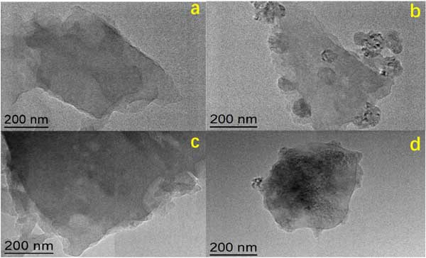 圖1:活性炭樣品的TEM圖像(a)原始活性炭,(b)7%甘氨酸改性活性炭,(c)5%氨改性活性炭,(d)5%氨和7%甘氨酸復合改性活性炭。