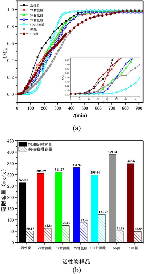 測試了選定的甲苯VOC對活性炭的吸附性能。在每個實驗運行中,甲苯通過裝有活性炭的吸附管直到達到平衡,即活性炭吸附劑被甲苯飽和。圖2(a)所示的穿透曲線呈現(xiàn)為甲苯吸附量吸附(ç/ç0)與接觸時間(噸,分鐘)六種的活性炭正在進行中,它們的飽和和突破吸附容量如圖2所示(b)。從吸附曲線可以看出,甘氨酸修飾的活性炭的穿透時間明顯延長,而飽和氨改性活性炭的時間延長�;钚蕴可霞妆酱┩肝侥芰Φ捻樞驗�10%甘氨酸改性活性炭>7%>5%>2%>5%氨改性活性炭>未改性活性炭>10%氨改性活性炭,而活性炭對甲苯飽和吸附容量的順序如下:5%氨改性>10%>7%甘氨酸改性>5%>2%>10%>未改性活性炭。可見甘氨酸修飾對甲苯吸附有顯著的正向影響。與原來的AC相比,甘氨酸改性的活性炭對甲苯的突破吸附能力分別提高了25%、50%、74%和147%,隨著甘氨酸濃度的增加呈上升趨勢。同時,甘氨酸改性的活性炭對甲苯的飽和吸附容量分別增加了15%、17%、25%和13%,且隨著甘氨酸濃度的增加先增加后減少。5%和10%的氨改性也提高了甲苯的吸附性能,但其優(yōu)勢主要體現(xiàn)在飽和吸附容量上,與原來的活性炭相比,分別提高了47%和32%。