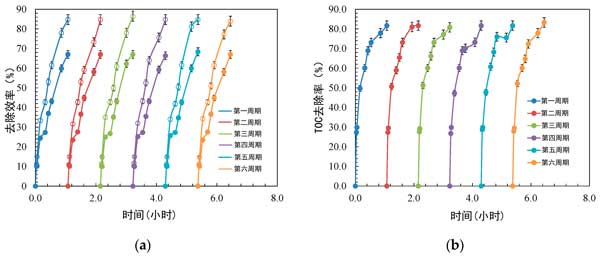 圖3:活性炭催化劑的吸附和光催化過程的去除效率。(a)初級降解,(b)礦化。