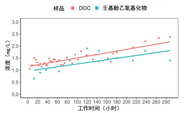 圖3:運行期間滲透液中DOC和壬基酚乙氧基化物濃度的變化。