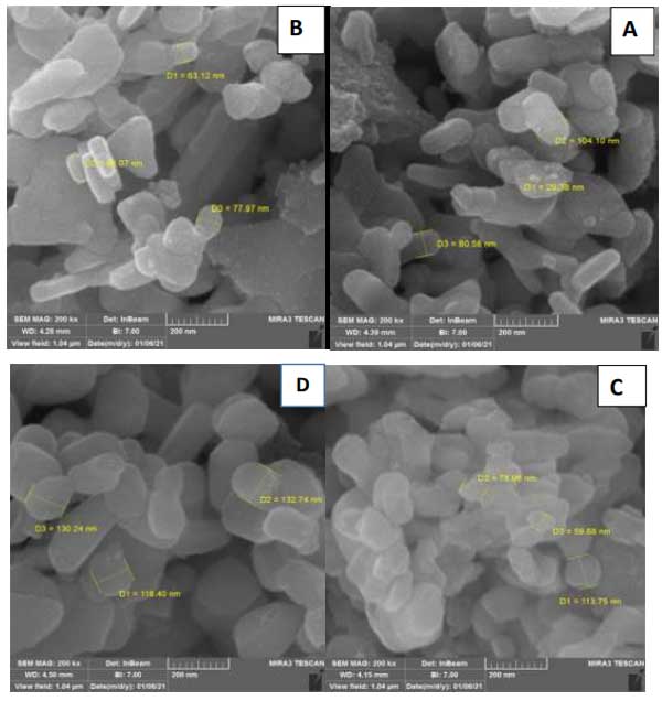 未活化的活性炭與物理活化的活性炭復合材料的合成使用水熱法制備了。根據(jù)該方法,金屬化氧化鐵銅納米粒子懸浮在30mL燒杯中,直接加入活性炭懸浮液,超聲處理30分鐘。然后將這兩種懸浮液在一個燒瓶中混合,在80℃下連續(xù)攪拌,直到溶劑完全蒸發(fā)。此時,收集所得固體并在100℃下干燥12小時獲得活性炭復合材料。利用掃描電鏡對合成的這幾種活性炭材料的表面形貌進行了研究。純氧化鐵銅納米粒子的表面形態(tài)如圖1A所示,它顯示了中等均勻的球形顆粒,粒徑約為31nm�;钚蕴繌秃喜牧系膱D像如圖1C所示,該圖像顯示了較小的均勻性,粒徑相對較大,并且存在顆粒團聚。這很可能是由于復合材料中存在活化后的活性炭,這可以增強表面協(xié)同效應,促使顆粒尺寸增加,因為在這些條件下晶體生長。復合材料氮鐵銅的圖像如圖1D所示,從該圖像可以看出,存在相對均勻的分布,球形顆粒幾乎與氧化鐵銅相似,但氧化鐵銅氮的粒徑相對大于氧化鐵銅。這可能是由于摻雜氮物種后晶體生長所致。