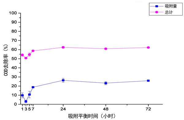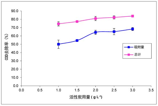 圖2顯示了在25℃、pH=7.5和170rpm的攪拌速率下,不同活性炭用量對COD去除的影響,持續(xù)24小時。我們測試了1.0、1.5、2.0、2.5和3.0g活性炭以確定合適吸附劑劑量。隨著活性炭濃度從1g增加到3g,觀察到COD去除率從50.0±5.1%和74.5±2.6%逐漸增加到吸附和總量的68.3±1.9%和83.9±1.0%。COD濃度從280.0±28.3略微下降至177.5±10.6mg。許多研究都報告說,隨著活性炭用量的增加,有機材料的去除率也會增加,這可以通過總比表面積和吸附劑上的活性位點來解釋。
