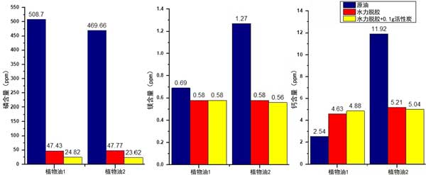 磷含量在兩個(gè)兩種植物油中主要由以所示的處理(水重量2%+活性炭0.1克)后減少圖2。植物油1的磷含量降低了大約95.22%,而植物油2的磷含量降低了大約相同的值(94.98%)。油液經(jīng)水脫膠后Mg、Ca含量略有下降,而Ca處理后略有升高。這一結(jié)果可能是由于在處理過(guò)程中活性炭中存在一些Ca解離回油相�;钚蕴繉�(duì)磷含量的大量降低是由于NaOH改性的活性炭具有極性、帶正電荷的表面。由于存在芳環(huán)簇和固有缺陷,它還具有磁力。在脫膠過(guò)程中將活性炭添加到植物油和水中時(shí),活性炭的芳環(huán)簇中的離域電子產(chǎn)生磁矩,強(qiáng)烈誘導(dǎo)磷脂磷酸頭部周?chē)捻槾判匝�。同時(shí),活性炭的極性/親水性也允許與極性水分子相互作用。水分子也被磁場(chǎng)激活,從而發(fā)生氫自旋從旁水到鄰水的重新定向,從而降低水的抗磁性�;钚蕴空T導(dǎo)的這種磁場(chǎng)會(huì)導(dǎo)致表面張力降低,削弱水分子的分子內(nèi)能。結(jié)果,更多的水分子被分解成H+離子和OH-離子,促進(jìn)更多水解反應(yīng)。這些現(xiàn)象與其他力量相結(jié)合:熱能和離心也會(huì)引發(fā)磷脂分子內(nèi)的鍵斷裂,導(dǎo)致磷酸頭部基團(tuán)從磷脂分子上分離(脫磷脂)。