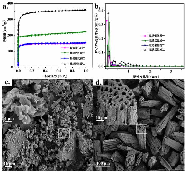 圖2:(a)N2吸收-解吸等溫線(xiàn)和(b)各種催化劑的孔徑分布。(c)活性炭催化劑一和(d)催化劑二的SEM圖像。