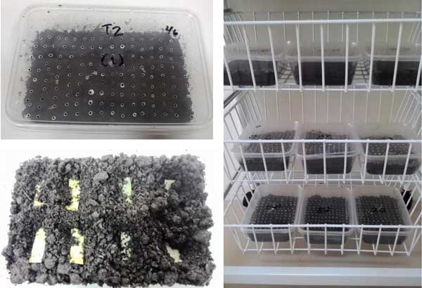 含活性炭和不含活性炭的纖維紙被切成3厘米x1厘米的條。這些紙?jiān)?5℃下干燥48小時(shí),干燥后的重量計(jì)算為初始干重。將紙張放入裝有堆肥土壤的塑料容器中,該土壤由農(nóng)業(yè)產(chǎn)業(yè)生產(chǎn)的堆肥生活垃圾制成,濕度為45%,并用多孔蓋子蓋住。試驗(yàn)組由12次重復(fù)組成,觀察12周,間隔4周(3次采樣)。采樣時(shí)間表示為T1、T2和T3。初始條件表示為T0。在取樣時(shí),取出紙片并用軟刷清潔。土壤中生物降解試驗(yàn)的描述如圖1所示。