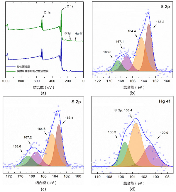 圖3:甲基汞吸附前后活性炭硫醇改性材料的XPS光譜,(a)活性炭(b)在甲基汞吸附之前和(c)之后的高分辨率S2p核心能級光譜,(d)以及在甲基汞吸附之后活性炭的Hg4f核心能級光譜。