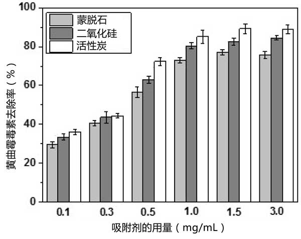 三種吸附劑對AFB1的吸附在25℃下進(jìn)行24小時。圖1顯示了活性炭和其它吸附劑用量的AFB1去除率。無論吸附劑劑量如何,使用活性炭時去除率更高,其次是二氧化硅和天然蒙脫石。正如預(yù)期的那樣,AFB1的去除率隨著吸附劑劑量的增加而增加,這可以通過AFB1與吸附劑之間的相互作用增加來解釋,包括氫鍵、孔填充和靜電吸引力。吸附劑量為1.0mg/mL時,黃曲霉毒素的去除率使用蒙脫石、二氧化硅和活性炭時,分別為73.23%、80.35%和85.09%。在較高的吸附劑量(1.5mg/mL)下,去除率分別略微增加至75.56%、83.48%和89.15%。在這個吸附系統(tǒng)中,當(dāng)吸附劑以較低濃度使用時,可用的吸附位點較少。因此,增加吸附劑濃度有效地增加了吸附位點的數(shù)量,從而提高了AFB1的去除率。但濃度過高時,吸附劑顆粒間會發(fā)生膠結(jié)、絮凝和團(tuán)聚現(xiàn)象。這導(dǎo)致可用吸附位點的數(shù)量穩(wěn)定或減少,并且去除率沒有進(jìn)一步提高。此外,當(dāng)吸收劑以高濃度使用時,可能會消除維生素E和甾醇等微量營養(yǎng)素,從而導(dǎo)致營養(yǎng)流失。因此,使用濃度為1.0mg/mL的吸附劑被認(rèn)為是合適的,因此在進(jìn)一步的實驗中被采用。