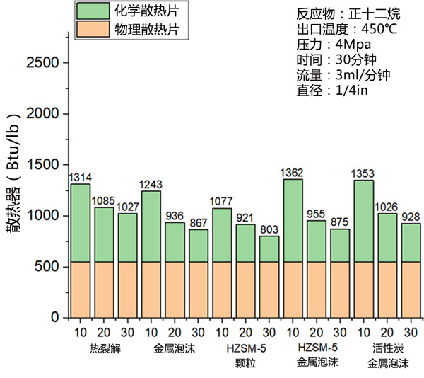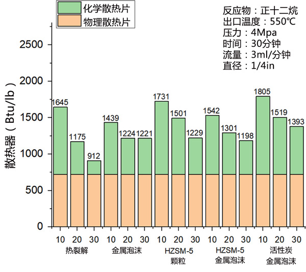 熱裂解和催化裂解產(chǎn)生的散熱片-十二烷在圖2顯示,溫度為450℃,壓力為4MPa。由于散熱器與使用的飛機冷卻技術(shù)直接相關(guān),因此應(yīng)慎重考慮。測量的散熱器值在10分鐘內(nèi)取平均值,通過將它們除以質(zhì)量流量將瓦特轉(zhuǎn)換為Btu/lb單位。反應(yīng)10分鐘后,HZSM-5/金屬泡沫和活性炭/金屬泡沫樣品的散熱片分別為1342和1353Btu/lb。兩種催化劑在10分鐘內(nèi)都表現(xiàn)出高散熱片。僅金屬泡沫和HZSM-5顆粒的初始散熱器分別為1243和1077Btu/lb。僅涉及金屬泡沫的反應(yīng)的熱沉低于熱裂解的熱沉。由于反應(yīng)溫度低,泡沫不作為金屬催化劑并占據(jù)反應(yīng)空間30分鐘。HZSM-5顆粒在反應(yīng)的前30分鐘內(nèi)導(dǎo)致最低的熱沉,因為氣體產(chǎn)率低且產(chǎn)生大量線性石蠟。相比之下,熱裂化的散熱器保持在高值30分鐘。因此,在低反應(yīng)溫度下,酸和金屬催化劑均表現(xiàn)出低催化效率并占據(jù)反應(yīng)空間。