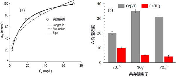 圖3:(a)浸漬活性炭吸附六價(jià)鉻的平衡等溫線,(b)競爭陰離子對平衡鉻濃度的影響。
