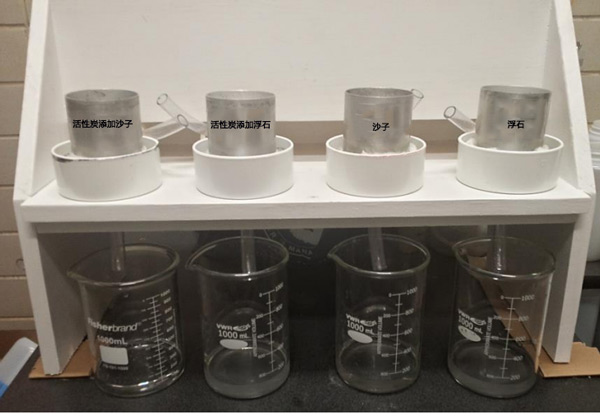 酸二氫鉀在去離子水中制備磷溶液,將活性炭稱(chēng)重到試管中,,并用36mL的16.3mg/L-1正磷酸鹽平衡,僅包括沙子或浮石樣品。將管在端到端振蕩器上以90min-1的頻率平衡24小時(shí),并通過(guò)0.2-μm膜過(guò)濾器過(guò)濾上清液。根據(jù)鉬酸鹽法,使用UV-VIS分光光度計(jì)分析濾液中的正磷酸鹽。總共16根柱子(直徑7.62厘米,高7.62厘米)用沙子或浮石填充到4.56厘米的深度(圖2)。十六列對(duì)應(yīng)于由兩種過(guò)濾器(沙子或浮石)和四種活性炭改進(jìn)材料組成的實(shí)驗(yàn),包括對(duì)照(無(wú)添加活性炭),一式兩份。將含活性炭改良劑和不含活性炭改良劑(按重量計(jì)5%)的沙子或浮石混合,然后將其干填充到柱中。每個(gè)柱子的底部都用粗棉布保護(hù),這樣可以大限度地減少過(guò)濾材料的損失。