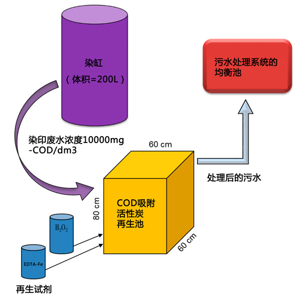 根據(jù)獲得的數(shù)據(jù)和當(dāng)前的紗線染色工藝,使用所提出的兩步處理系統(tǒng)處理來(lái)自常用的200L染浴的高COD染色廢水看起來(lái)適用,并提出了建議如圖3所示。據(jù)我們所知,目前運(yùn)營(yíng)的染色設(shè)施中沒(méi)有這種建議的設(shè)置。設(shè)計(jì)容積(即200L)足以容納一批染缸出水,使高COD廢水可直接進(jìn)入擬建裝置的吸附和再生。根據(jù)結(jié)果,去除50-60%的COD將大大減少回流到平衡罐的COD,從而避免現(xiàn)有廠內(nèi)生物處理單元的過(guò)載情況。為了運(yùn)行所提議的裝置,首先,將來(lái)自染色池的一定量的高COD廢水引導(dǎo)至充滿(mǎn)指定活性炭的反應(yīng)單元(如果處理120L廢水,則為20kg)進(jìn)行24小時(shí)吸附。由于結(jié)果表明染浴出水COD在酸性pH值下吸附更多,二是對(duì)處理后的廢水進(jìn)行篩分,24小時(shí)后排至其廢水處理設(shè)施的頭部(即平衡池)。第三,分別串聯(lián)添加初始濃度為2.12mmol/dm3和2.5%的乙二胺四乙酸鐵鈉和過(guò)氧化氫,以啟動(dòng)活性炭再生1小時(shí)。從連續(xù)運(yùn)行來(lái)看,兩步法處理高COD染色廢水的應(yīng)用前景看好。然而,我們確實(shí)注意到該技術(shù)的當(dāng)前應(yīng)用可能僅限于染浴設(shè)計(jì)及其操作。染浴的高COD流出物發(fā)生在染色過(guò)程的第一次排放,但對(duì)于大多數(shù)可用的染浴操作,根據(jù)不同的COD濃度對(duì)每批流出物進(jìn)行分離是不適用的。一些染色裝置或染色工藝的改造被認(rèn)為是必要的。