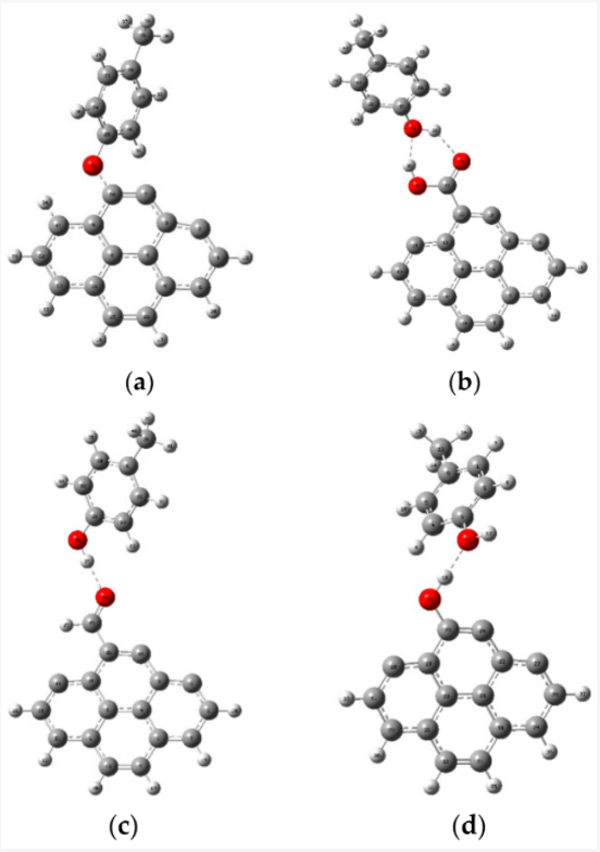 預(yù)計(jì)甲酚在活性炭上的吸附將通過(guò)各種類(lèi)型的相互作用進(jìn)行,例如電子供體-受體機(jī)制、靜電相互作用、π-π相互作用和氫鍵形成。然而,在各種類(lèi)型的相互作用中,活性炭和被吸附物之間的氫鍵是有助于吸附過(guò)程的重要相互作用類(lèi)型之一。因此,在本研究中,使用DFT方法研究了對(duì)甲酚和活性炭之間的氫鍵相互作用�?紤]到它們之間的氫鍵,研究了對(duì)甲酚與原始活性炭和功能化活性炭的相互作用。圖1代表各種相互作用的優(yōu)化結(jié)構(gòu)。
