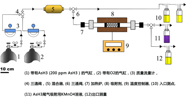 實(shí)驗(yàn)裝置的方案在圖1提供。將氣流以200mL/分鐘的氣體流速引入混合器中。該氣體由稀釋在O2(0-1.2%)中的AsH3(200ppm)組成。然后預(yù)混合氣體進(jìn)入填充有0.2g活性炭吸附柱的固定床。設(shè)置兩個(gè)采樣口:一個(gè)用于進(jìn)口氣體,一個(gè)用于出口處理后的殘余尾氣。廢氣經(jīng)酸性KMnO4處理。在這項(xiàng)研究中,AsH3去除效率和吸附容量用于評(píng)估活性炭的砷吸附能力。所有實(shí)驗(yàn)重復(fù)3次,計(jì)算標(biāo)準(zhǔn)差和平均值。