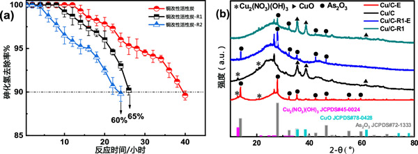 銅改性活性炭通過(guò)水洗和吹掃氣體法進(jìn)行再生。為此,活性炭樣品首先在100℃的熱空氣中活化3小時(shí)。然后用去離子水浸泡清洗4-5次,放入電熱風(fēng)烘箱中110-120℃烘干。之后,將樣品置于氮?dú)鈿夥障碌墓苁綘t中,并使用程序升溫控制器升高溫度�?紤]到通過(guò)在180℃下烘烤獲得的材料,溫度首先設(shè)定在20-180℃。之后,停止加熱,將樣品冷卻至室溫。取出樣品,停止氮?dú)饬�,�?duì)再生材料進(jìn)行測(cè)試。如圖3a所示,R的再生效率(R為再生吸附劑與新鮮吸附劑的穿透時(shí)間之比)在一個(gè)再生循環(huán)后為65%。在第二次再生循環(huán)后,樣品恢復(fù)效率R達(dá)到60%,證實(shí)了活性炭吸附劑對(duì)去除AsH3具有合理的再生能力。為了確定活性炭吸附劑再生后表面相的變化,通過(guò)XRD分析活性炭吸附劑。如圖3b所示,再生后活性炭-R1中35.6°、38.8°和61.8°的CuO衍射峰強(qiáng)度明顯增加,但沒(méi)有Cu2(NO3)峰被找到。這表明在再生過(guò)程中回收的一些CuO物種可能被中間體Cu2(NO3)(OH)3轉(zhuǎn)化。此外,活性炭-R1樣品中As2O3在28.0°、32.2°、35.5°、42.6°、46.4°、55.0°和59.6°處的結(jié)晶峰明顯減弱。推測(cè)中間體Cu2(NO3)(OH)3向吸附活性中心CuO的轉(zhuǎn)變和結(jié)晶As2O3的分離可能是活性炭吸附劑再生性能好的原因。