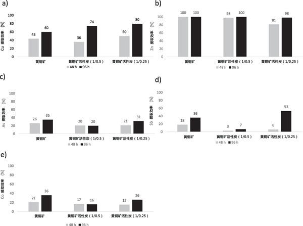 使用帶有攪拌的恒溫浴用于浸出測試,該測試在90℃和250rpm下在250mL硼硅酸鹽玻璃罐中使用H2SO4溶液(在pH值1)濃度為5gL-1的Fe(III)。在浸出過程中控制溫度(90℃)和攪拌速度(250rpm),直到48和96小時。浸出劑溶液的Eh為547mV。硫酸的純度和硫酸鐵(III)分別為97%和99.5%。在每個實驗中,在硼硅酸鹽玻璃罐中稱量2.5g。除對照外,活性炭比為1/0.5和1/0.25。然后,加入50mL浸出劑。使用兩個反應時間對每種活性炭混合物進行兩次浸出實驗:第一次直到48小時,第二次直到96小時。在浸出實驗期間,每24小時打開一次罐子,以確保浸出系統(tǒng)有足夠的氧合。在反應結束時(48小時和96小時),將紙漿過濾并用50mL/H2SO4洗滌兩次pH2的溶液以回收吸附在活性炭表面上的金屬。通過測定浸出和洗滌溶液中的Cu、Zn、As、Co和Sb的含量。