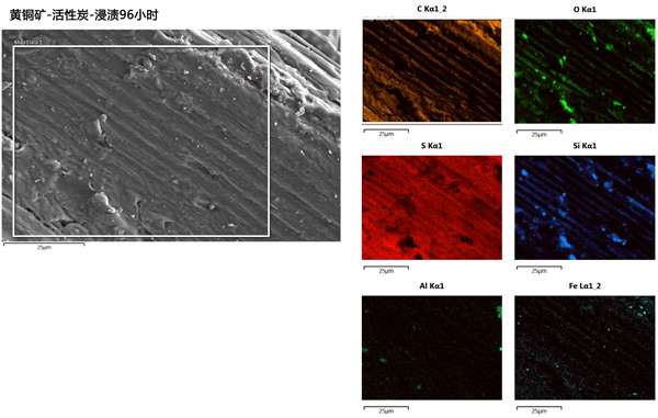 選擇在48和96小時浸出后獲得的固體樣品進行后續(xù)表征。由于硫化物硫氧化成元素硫,形成的新物質是硫。需要注意的是,添加活性炭和未添加碳的浸出殘渣中的硫含活性炭催化劑從硫化銅中浸出金屬量存在很大差異。浸出殘渣黃銅礦在96小時的SEM-EDS顯微照片顯示硫吸附在活性炭的表面(圖2)。這種現(xiàn)象可以在活性炭催化的黃銅礦浸出機理中發(fā)揮重要作用,抑制其表面硫鈍化層的形成,從而提高該過程的動力學。碳材料對元素硫的吸附可以簡化從浸出渣中去除硫的過程,從而減少最終礦山廢物對環(huán)境的影響。