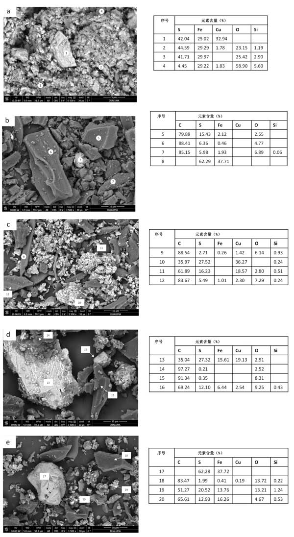 最終殘留物的SEM-EDS圖像在圖2顯示,并證實了通過XRD獲得的結果。圖2a顯示了礦物浸出后固體殘渣的SEM圖像。可以觀察到大的黃銅礦顆粒的存在(點1),黃鐵礦的小顆粒具有不同的氧化礦物(點2、3和4)。樣品活性炭浸出后的固體殘留物圖像(圖2b)顯示活性炭的存在,其表面具有硫原子和一些Fe(點5、6和7)和黃鐵礦(點8)。沒有觀察到銅的存在,這與其高提取值(99.1%)一致。圖2c顯示了樣品活性炭1:0.25浸出后獲得的固體殘留物的圖像。在活性炭的表面上可以觀察到硫和銅的存在,可能是由于CuS(點9-12)。用生物炭浸出礦物后的固體殘渣分析見圖2d(比例1:1)和(比例1:0.25)。根據XRD分析,有黃銅礦顆粒(點13)類似于沒有生物炭的礦物浸出的固體殘渣。與添加活性炭相比,生物炭顆粒的表面硫含量較低(點14和15),表明生物炭吸附能力較低,這與生物炭的較低表面積一致。生物炭表面上存在的一些硫可能是由于與浸出劑的反應和硫物質的低吸附性。最后,觀察到不同礦物的聚集體(第16點)。關于生物炭比例為1:0.25的固體殘留物,黃鐵礦的存在(第17點),生物炭與少量S、Cu和Fe結合(第18點),可以觀察到不同礦物和碳顆粒的小顆�;旌衔�(第19點和第20點)。