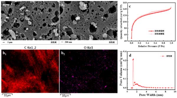 圖1:活性炭的SEM(a1,a2)、EDS(b1,b2)、N2吸附-脫附等溫線(xiàn)(c)和孔徑分布(d)圖像。