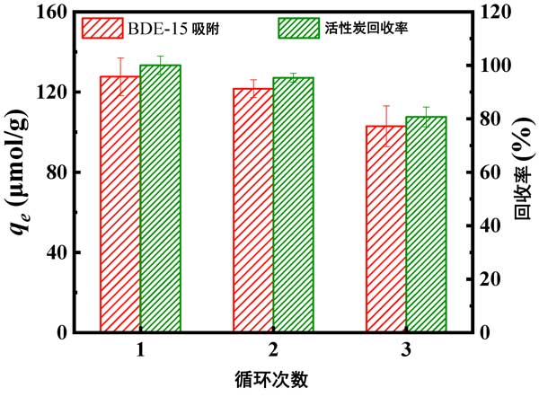 為研究活性炭處理洗脫液后的循環(huán)利用性能,采用甲醇洗脫活性炭進(jìn)行再生回用。如圖3所示,在三個(gè)回收-吸附循環(huán)中,活性炭的吸附量略有下降,活性炭的吸附量保持在103μmol/g以上,下降了25μmol/g(下降了19%)�;钚蕴勘憩F(xiàn)出良好的可回收性和可重復(fù)使用性,有利于實(shí)際應(yīng)用。