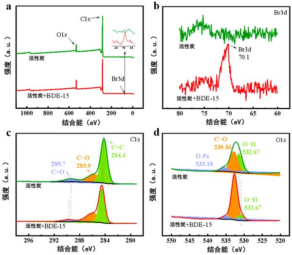 圖4:吸附前后活性炭的XPS全光譜(a)、Br3d光譜(b)、C1s光譜(c)和O1s光譜(d)。
