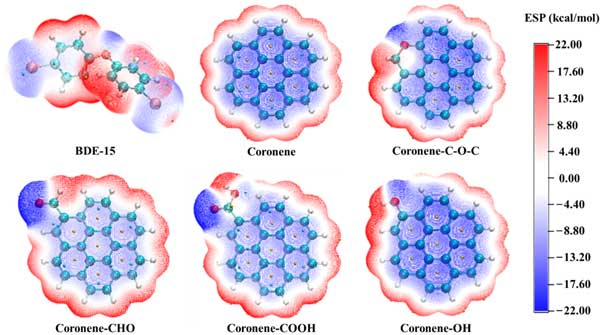 為進(jìn)一步研究PBDEs與活性炭之間的微觀(guān)相互作用機(jī)制,通過(guò)計(jì)算化學(xué)研究了活性炭結(jié)構(gòu)模型與BDE-15之間的弱相互作用。根據(jù)表征結(jié)果,構(gòu)建了以暈苯為基本結(jié)構(gòu)的純碳結(jié)構(gòu)模型,以及羧基、羥基、醛和醚取代的結(jié)構(gòu)模型,模擬了活性炭的不飽和碳結(jié)構(gòu)和含氧官能團(tuán)結(jié)構(gòu)。BDE-15和五種活性炭結(jié)構(gòu)模型的靜電勢(shì)如圖5所示。BDE-15在其溴原子和氧原子附近顯示出負(fù)靜電勢(shì),而在其他區(qū)域,尤其是在其氫原子附近,則顯示出正靜電勢(shì)。這是因?yàn)殇逶雍脱踉拥碾娯?fù)性大于碳原子,而氫原子的電負(fù)性最小。在Coronene的結(jié)構(gòu)中,所有的碳原子都表現(xiàn)出負(fù)的靜電勢(shì)特征,而氫原子則表現(xiàn)出正的靜電勢(shì)特征。含氧官能團(tuán)的引入增加了基團(tuán)附近的正靜電勢(shì)面積和負(fù)靜電勢(shì)面積,屬于結(jié)構(gòu)中極性最強(qiáng)的區(qū)域。根據(jù)正負(fù)靜電勢(shì)相互吸引的原理,BDE-15和活性炭結(jié)構(gòu)模型可以形成多種復(fù)合構(gòu)型�?梢酝茰y(cè),基團(tuán)附近存在強(qiáng)靜電勢(shì)區(qū)使得BDE-15更容易與基團(tuán)結(jié)合。
