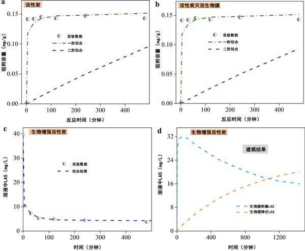 圖3:磺酸基團去除動力學(xué)在活性炭、b滅活生物膜-活性炭、c生物增強活性炭和d生物增強活性炭中的LAS去除動力學(xué)的批量實驗。