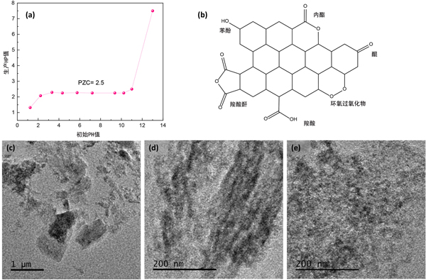 圖1:活性炭載體的研究:(a)零電荷點(PZC)的測定:反應24小時后所得pH值作為起始pH值的函數。(b)不同含氧基團。