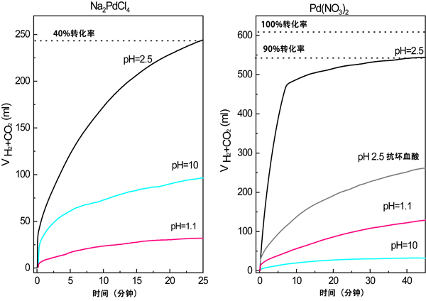 圖2:對于通過使用兩種Pd前體在不同的浸漬pH值下制備的活性炭催化劑,所產生的重整氣體(H2+CO2)的體積隨時間變化。