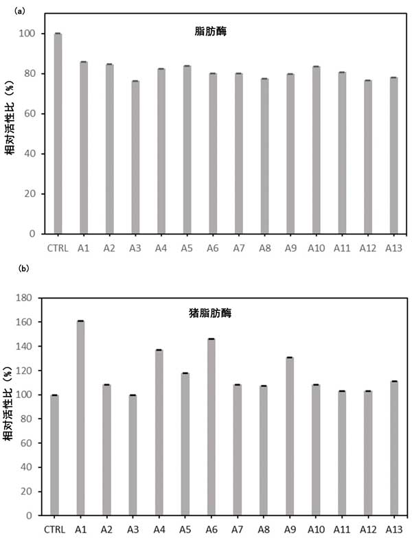 圖2:(a)固定在A1至A13的活性炭樣品上后,脂肪酶的相對(duì)活性。數(shù)據(jù)以95%的置信區(qū)間(誤差線(xiàn))呈現(xiàn)。(b)固定在活性炭樣品上后豬脂肪酶的相對(duì)活性從A1到A13。