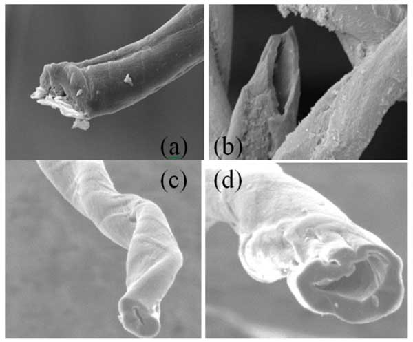 通過煅燒和HNO3、H2O2和KOH活化,廢棉纖維成功轉化為不同結構的活性炭。圖1顯示了三種活性炭的SEM圖像。可以看出,化學活化有助于大孔隙的形成。在整個纖維長度上可以觀察到一個空心芯,直徑約為0.5–5.0µM,形狀幾乎為圓形。活性炭具有高度多孔的結構,核心直徑在大約0.5和5μM之間(圖1b,d)。這種大孔隙率可能與纖維內壁木質素的化學破壞有關。參考活性炭(圖1a)呈現(xiàn)大孔隙,而形態(tài)特征是纖維中芯的出現(xiàn),其直徑取決于活化劑。使用過氧化氫作為活化試劑獲得最大直徑(圖1b)。如圖1b-d所示,前體的結構(最初具有干凈的表面)在每次化學處理后都會被破壞。有趣的是,其中一種活性炭的表面在化學活化的影響下發(fā)生明顯變化(與其他活性炭相比)。