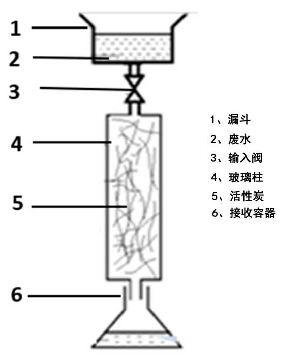 通過在密封玻璃瓶中將已知量(4.0g)的活性炭與50mL實際廢水樣品進行反應,進行批量吸附平衡實驗。測試了具有不同初始硫濃度(100、300、500、800和1000mg·L-1)的五個樣品。將瓶子在恒溫搖床上放置24小時,直至達到平衡(最終pH值:10.5)。用于床吸附實驗的裝置的示意圖如圖2所示。將碳化纖維填充到玻璃柱中以研究它們的吸附能力。廢水被引入漏斗并通過輸入閥以將流量調節(jié)為4–5.10m3·h-1。首先,使用流經(jīng)柱的蒸餾水潤濕床吸附裝置以改善活性炭纖維的潤濕特性。其次,允許漏斗中的煉油廠廢水樣品內容物通過活性炭床通過重力排放到接收容器。每小時回收處理過的水。
