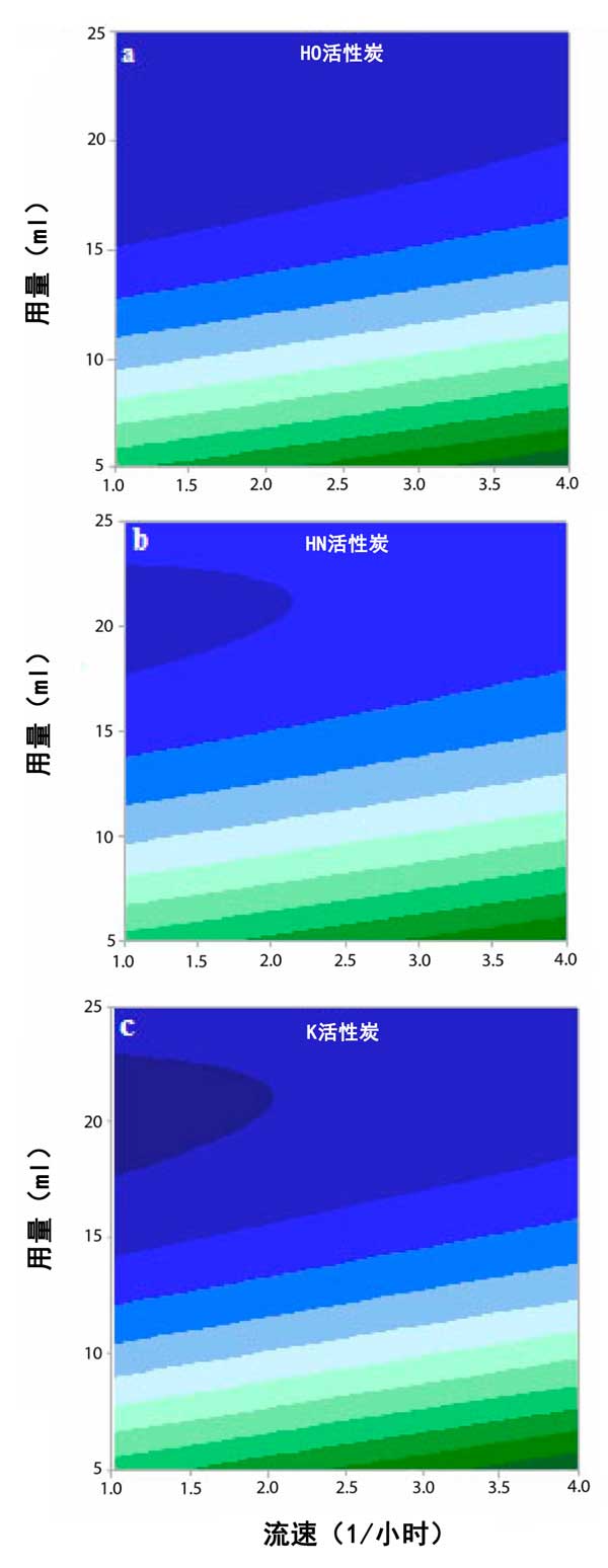 圖3:COD、(a)OH活性炭、(b)HN活性炭和(c)K活性炭的等值線圖。