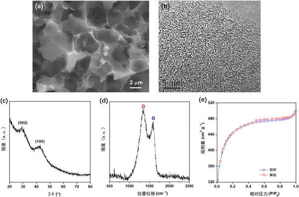 圖1:所制備活性炭的表征結(jié)果:(a)FE-SEM和(b)高分辨率TEM圖像、(c)XRD圖、(d)拉曼光譜和(e)N2吸附/脫附等溫線。