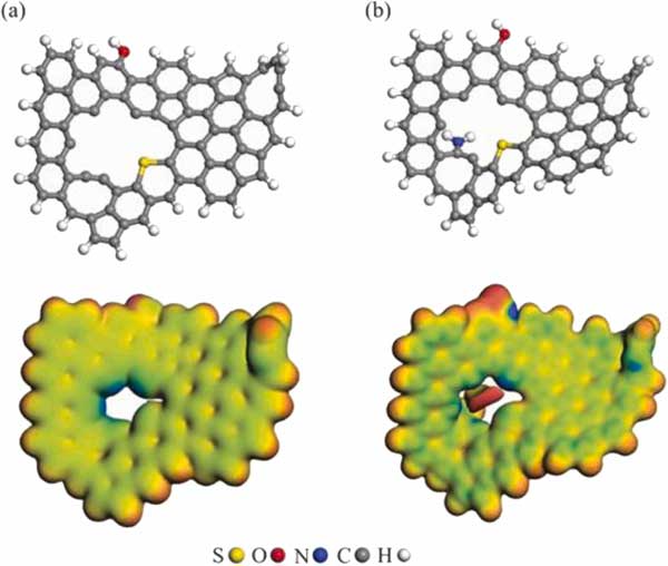 圖4:(a)活性炭和(b)浸漬活性炭吸附劑的優(yōu)化幾何結構(上圖)和相應的MEP等值面。