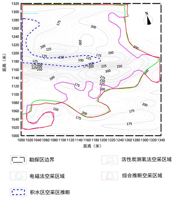 本次調(diào)查工作將電磁法與活性炭測氡法相結合,形成綜合物探方法,對某礦區(qū)地下采空區(qū)情況進行了研究。首先,電磁法用于探測采空區(qū)的深度探測。發(fā)現(xiàn)1個低阻異常帶和1個高阻異常帶,推測后者為采空區(qū)異常帶,前者由采空區(qū)積水或大鵬地層水富集形成,推測為采空區(qū)積水異常帶。然后使用用于測氡的活性炭方法來推斷地下采空區(qū)的位置和范圍。結合電磁法勘探成果,推測該采空區(qū)為氡值異常帶。