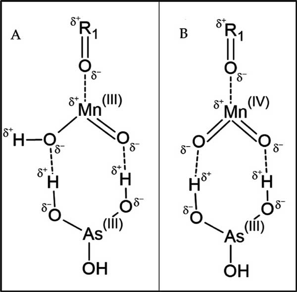 圖4:(A)顯示反應(1)的產物,其中MnO被氧化為MnOOH。(B)顯示反應(2)的產物,其中MnO被氧化成MnO2。As(III)通過氫鍵物理吸附到負載Mn的表面。