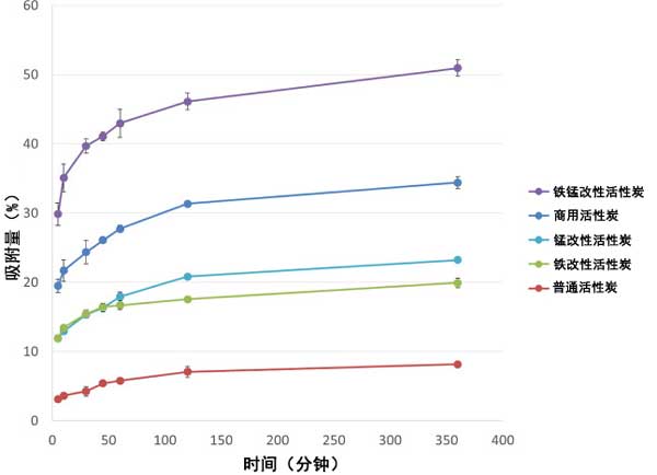 復合鐵錳活性炭顯示出最高的吸附容量,6小時后的吸附量達到總吸附量的50.93±1.17%。這表明比標準活性炭和單金屬負載活性炭都有顯著改進。鐵錳負載活性炭的二元系統(tǒng)協(xié)同工作,在吸附過程中利用了上述所有吸附機制,使得吸附容量比單金屬負載活性炭材料增加更多。