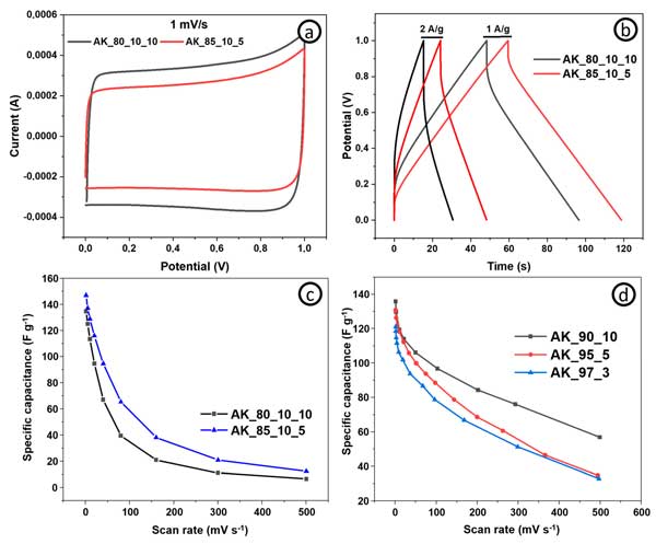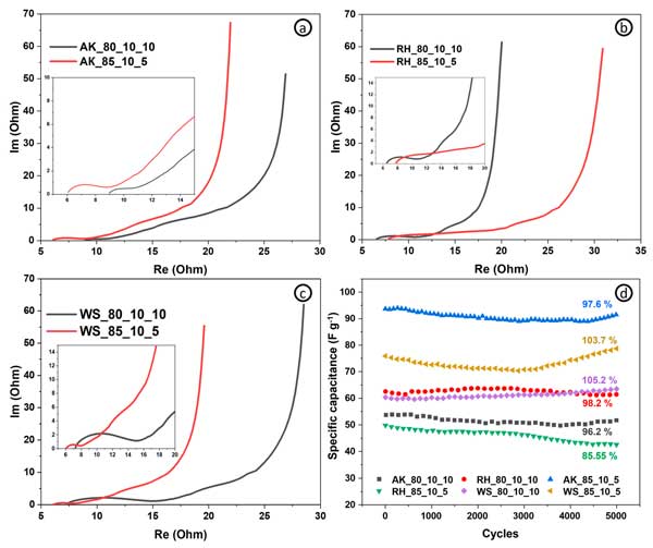 活性炭電極表現(xiàn)出比常規(guī)樣品更好的比電容和能量密度(相同功率密度下的最大能量密度為4.8vs.4.4Wh/kg-1),因為有更多的活性材料,而電阻、倍率能力(圖3c)和功率密度—這取決于電極的導電能力(基于導電添加劑含量)。圖3d顯示了具有不同活性炭和碳納米管含量的電極在不同掃描速率下的比電容。碳納米管含量為10%的電極在1mV/s-1下實現(xiàn)了137F/g-1的最高比電容。從圖中可以清楚地看出,就比電容而言,活性炭和碳納米管的最佳比例為90:10。綜上所述,我們可以得出這樣的結(jié)論:對于超級電容器的自支撐電極,活性成分、結(jié)合成分和導電成分的最佳比例為85:10:5�?梢赃M一步評估具有這種含有源自其他生物前體的活性材料的組合物的電極的電化學性能。