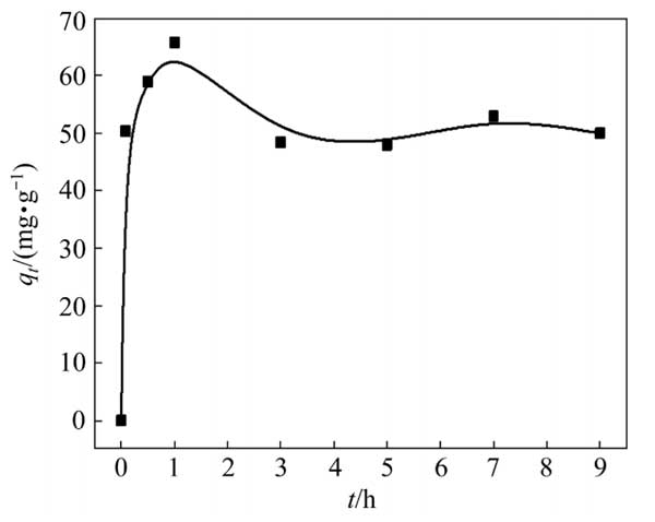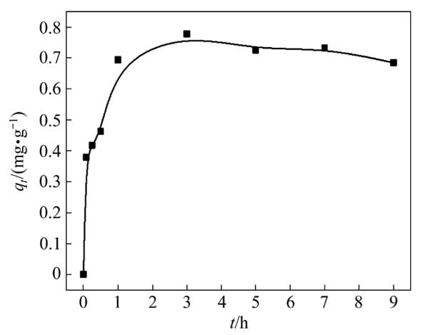 用100mL硫代硫酸銅溶液進(jìn)行銅吸附動(dòng)力學(xué)試驗(yàn),初始銅濃度為3g/L。硫代硫酸鹽與銅的摩爾比為8:1。除另有說(shuō)明外,0.5g活性炭用于吸附試驗(yàn)。圖2顯示了Cu(S2O3)23−在活性炭上的吸附動(dòng)力學(xué)。活性炭對(duì)銅的吸附容量在前1h急劇增加,隨后略有下降并趨于穩(wěn)定。