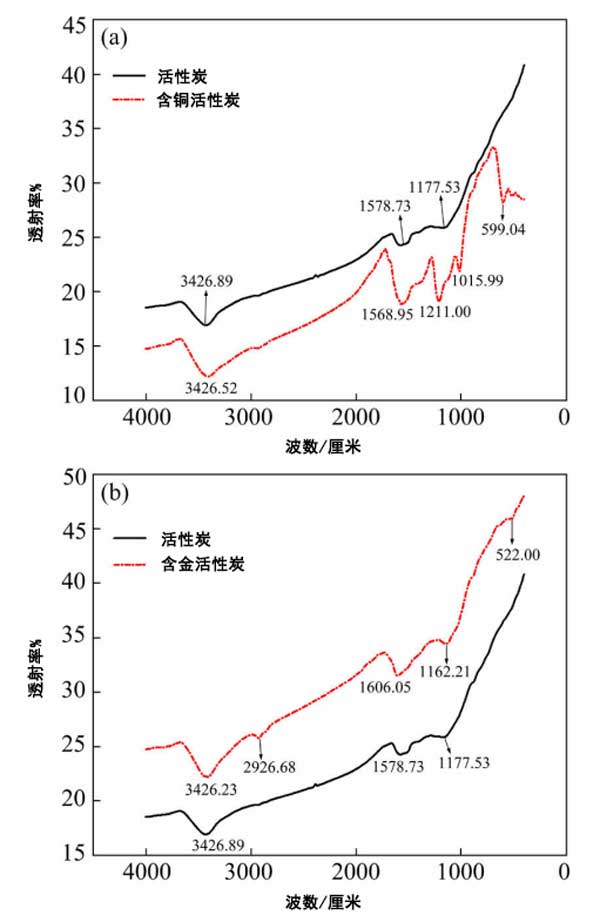 圖4:原活性炭和含銅碳(a)、含金碳(b)的FTIR光譜。