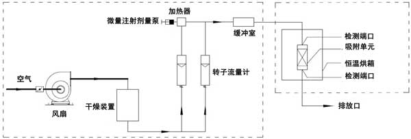 動(dòng)態(tài)吸附實(shí)驗(yàn)在室溫(25℃)下進(jìn)行。實(shí)驗(yàn)裝置由氣體分配系統(tǒng)和吸附系統(tǒng)兩部分組成。吸附系統(tǒng)由恒溫箱和吸附單元組成。檢測(cè)口位于吸附系統(tǒng)之前和之后。動(dòng)態(tài)法測(cè)定活性炭對(duì)脈沖負(fù)荷緩沖性能的裝置如圖1所示。本實(shí)驗(yàn)以乙醇或二甲苯為單一檢測(cè)對(duì)象。氣體分配系統(tǒng)包括風(fēng)扇、干燥裝置、轉(zhuǎn)子流量計(jì)、微注射計(jì)量泵、加熱器和緩沖室。使用FT-IR傅里葉氣體分析儀作為測(cè)量設(shè)備。在氣體分配系統(tǒng)中,在短時(shí)間內(nèi)(2分鐘和5分鐘),微注射計(jì)量泵的注射量迅速增加到原始體積的預(yù)定倍數(shù)(10倍和20倍),以產(chǎn)生脈沖負(fù)載。在吸附系統(tǒng)中,吸附單元內(nèi)放置活性炭。吸附單元的直徑為31mm�;钚蕴康奶畛涓叨确謩e為2cm、4cm、6cm、8cm。將吸附裝置置于恒溫箱內(nèi)。吸附劑和吸附物的入口空氣保持在室溫。進(jìn)行了吸附劑在室溫下吸附吸附質(zhì)的脈沖加載實(shí)驗(yàn)。潔凈空氣通過干燥裝置后,利用轉(zhuǎn)子流量計(jì)將其按特定比例分成兩個(gè)通道。通過微注射泵將特定濃度的乙醇或二甲苯氣體注射到氣體中。另一種氣體用作稀釋氣體。兩種氣體流入緩沖室,完全混合后進(jìn)入恒溫箱。穩(wěn)定的氣體按照實(shí)驗(yàn)設(shè)定的濃度、流量和溫度進(jìn)入吸附單元。在通過吸附單元之前和之后測(cè)量乙醇或二甲苯的濃度。
