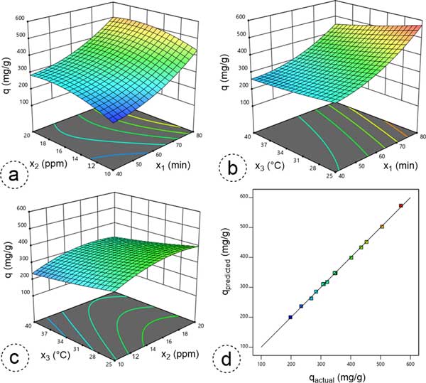 圖3:3D響應(yīng)曲面圖說明了雙自變量的綜合影響(a)接觸持續(xù)時(shí)間與入口濃度(x1—x2)、(b)接觸持續(xù)時(shí)間與溫度(x1—x3)和(c)入口濃度與溫度(x2—x3)和(d)比較苯吸附的實(shí)際吸附容量(q)和預(yù)測(cè)吸附容量(q)的圖。