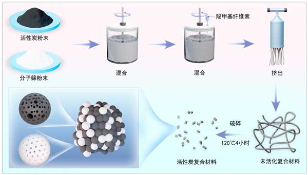活性炭之所以特別適合用于吸附過(guò)程,是因?yàn)樗哂懈叨榷嗫椎臒o(wú)定形結(jié)構(gòu),能夠吸附各種分子。它具有微孔和中孔,可以容納各種大小的分子,補(bǔ)充了分子篩的孔隙特異性�;钚蕴窟具有利用功能基團(tuán)改變其表面化學(xué)性質(zhì)的潛力,從而增強(qiáng)其與目標(biāo)分子的相互作用。本文以羧甲基纖維素為黏合劑,通過(guò)機(jī)械混合和擠出法制備了一系列 華活性炭分子篩復(fù)合材料(圖1)。